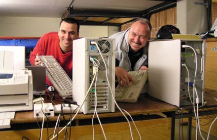 Die Herrscher über Zahlen und Kabel - v.li. Jörg u. Dieter Velten in ihrem Element. Sie sorgen für den Ergebnis-Dienst und aktuelle Kontakte von Mayen hinaus in die Hockey-Welt per Internet, Telefon u. Fax.
