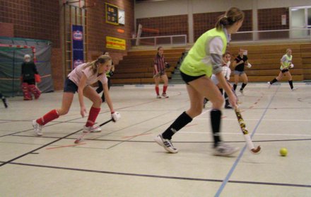 Wie fleißige Bienen die Damen des WHV (Westdeutschen Hockey Verbandes) samt Trainer bei ihrer ersten Trainingseinheit in der Realschul-Sporthalle in Mayen.