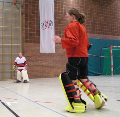 Das Training der Torfrauen (Schleswig-Holstein?) läßt auch mal einen Blick auf die große DHB-Fahne zu.