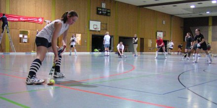 Voll konzentriert auf das Training die Mädels der Landesauswahl Rheinland-Pfalz / Saar in der Burghalle, da interessierte auch nicht die akrobatischen Balance Übungen der mayener Hockey-Herren beim Aufhängen der letzten Transparente.
