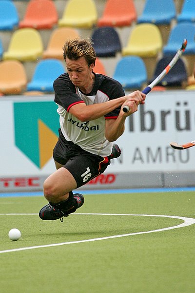 Lob gebührt hier wohl sowohl dem akrobatischen Einsatz von Maxi Schröter (GER) - wie auch dem Fotografen von Hockeyimage.net Who did better? Maxi Schröter (GER) with his tomahawk shot or the photographer from Hockeyimage.net with his camera? © hockeyimage.net