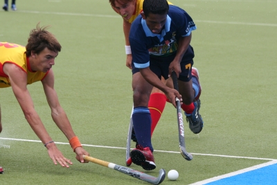 A.B.Cheeyana (IND) wird von Manel Terraza (ESP) an der Viertellinie gestoppt. A.B.Cheeyana (IND) was stooped at the 25-yard line by Manel Terraza (ESP). © hockeyfocus.de