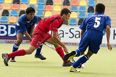Simon Gougnard (BEL) setzt sich gegen die Malayen durch. Simon Gougnard (BEL) stands up to the Malaysians. © hockeyfocus.de