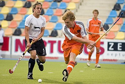 Jo Naughalty (ENG) und Klaas Vermeulen, the captain of the Netherlands. © hockeyfocus.de