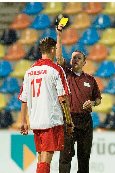 Warren McCully (Schiedsrichter IRL) vergiebt die dritte gelbe Karte für Polen an Pawel Bratkowski. Warren McCully (Umpire IRL) shows Poland's third yellow card to Pawel Bratowski. © hockeyfocus.de