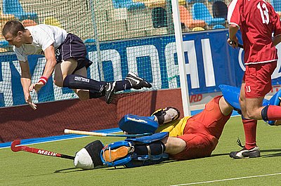 Peter Dobson (ENG) und Keeper Stefan Maciol (POL) im Zweikampf © hockeyfocus.de