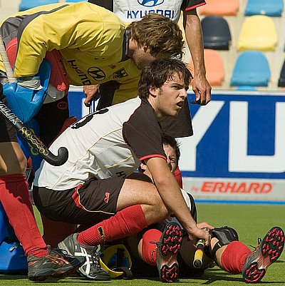 Philipp Collot und Torwart Nicolas Jacobi kümmern sich um ihren Kapitän Christian Münz (GER) Philipp Collot und Torwart Nicolas Jacobi take care of their Captain Christian Münz (GER) © hockeyfocus.de