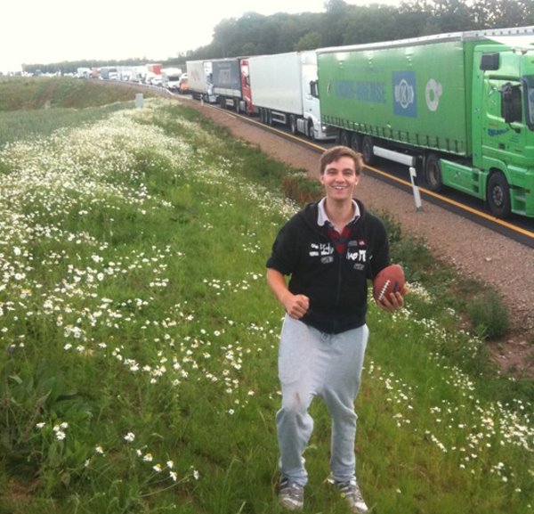 Da die Jugendvertreter aus allen Teilen Deutschlands kommen, war ein Treffen direkt in Burghausen geplant. Micha hatte kostenbewusst eine Ferienwohnung für alle gebucht. Friederike und Sophie reisten aus Berlin und Hamburg mit dem Flugzeug an, Felix kam aus Sensheim mit dem Zug. Die drei Westdeutschen Micha, Ivo und Kilian kümmerten sich um die Logistik und „Truppenversorgung“. Es wurde ein Transporter angemietet, Kunstrasenrollen, Airhockeyfeld, alle Arten Lebensmittel und Maskottchen Schlenzi verstaut, und los ging quer durch die Republik. Verstaut blieb das „Unwort des Tages“, denn vor einem langen Wochenende waren wir nicht die einzigen, die in den Süden wollten. 13 Stunden Fahrzeit für knapp 700 Kilometer sind rekordverdächtig. Doch Hockeyspieler sind innovativ. Die Zeit im Stau wurde mit American Football Übungen auf der anderen Seite der Leitplanke verbracht. Schlenzi achtete in der Zeit auf das Auto.