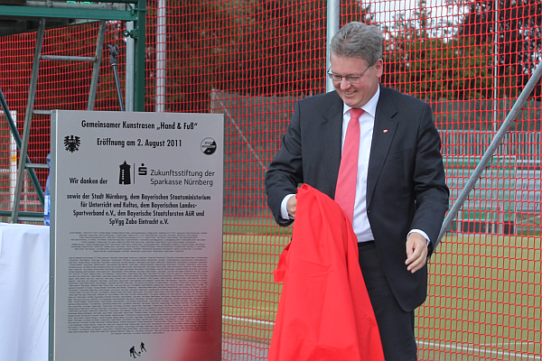 Der Vorstandvorsitzende der Sparkasse Nürnberg Dr. Matthias Everding enthüllte eine Tafel auf der allen, die zum Zustandekommen des Platzes beigetragen haben gedankt wird.