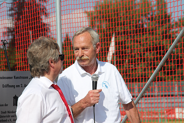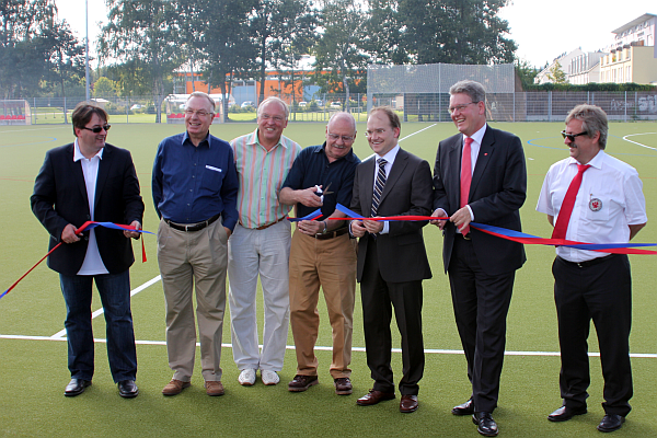 Das Band zur Einweihung wurde durchschnitten von: Gerhard Frieser (SPVGG Mögeldorf 2000), Alt-Oberbürgermeister Dr. Peter Schönlein (Zukunftsstiftung der Sparkasse Nürnberg), Gerhard Danzl (SpVgg Zabo Eintracht), Hermann End (Nürnberger HTC), Sebastian Brehm (Stadt Nürnberg), Dr. Matthias Everding (Sparkasse Nürnberg), Klaus Ehbauer (Nürnberger HTC)