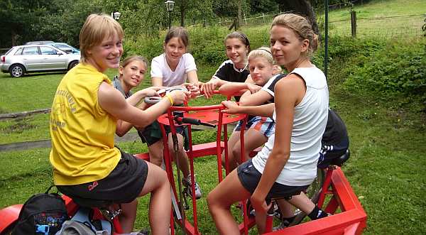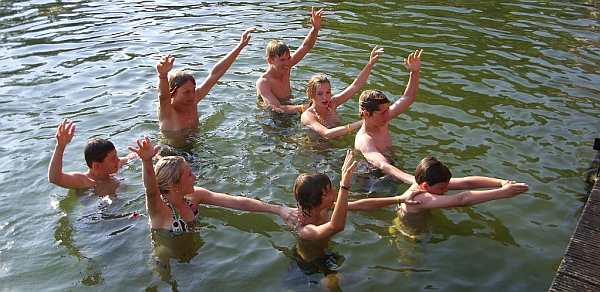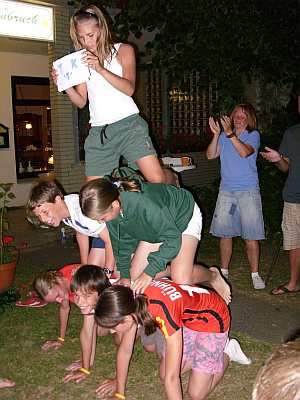 Hier stellten wir viele Rekorde im Stapelspringen auf: 16 auf einen Streich. Jeden Abend gab es die sog. „Kritiksitzung“ im Flur und durch die richtige Antwort im Kurz-Quiz durfte ein Teilnehmer den geheimen Umschlag - auf den wir natürlich alle sehr gespannt waren - mit dem Programm für den nächsten Tag öffnen und vorlesen. Am Finaltag fiel sogar die „Morgenandacht“ aus und nach dem großen Abschlussturnier verbrachten wir den Nachmittag mit Wasserspielen (Wettschwimmen,