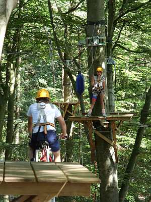 Jeder bewältigte zumindest die einfacheren Parcours trotz seiner Höhenangst. Die Highlights befanden sich auf der roten und schwarzen Strecke: ein umgestyltes Fahrrad in 12 Metern Höhe, ein Snow-Board, eine Schaukel, eine Kletterwand und für die Jungs schmerzvolle Seilbahnen zurück zum Boden. Nach diesen drei Tagen hatten wir wirklich alle Muskelkater in Armen und Beinen.