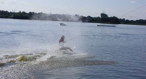 Obwohl für einige das Wasserski fahren noch ganz neu war und man so einige Spülungen bekam, schafften alle nach einem oder doch mehrmaligem Scheitern und dem folgenden nervenaufreibenden Rückweg zum Start durch Brennnesseln, Knie hohen Schlamm und spitzen Kies ihre Runde. Und sei es durch Mithilfe von Knölli auf dem Knee-Board im Duett fahren.