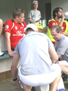 „Die Mannschaft hat sich trotz der erheblichen Strapazen hier voll reingehängt“, lobte Weise. Früh ging das Team um Kapitän Timo Weß, der ab der Halbzeitpause wegen einer Ansatzreizung der Kniescheibensehne geschont wurde, in Führung. Nach einem Freischlag von Youngster Tobias Hauke zentral am Kreisrand, stand Matthias Witthaus genau richtig, um die Kugel am Pfosten ins Tor zu blocken. Die bereits als Afrikameister für die Olympischen Spiele qualifizierten Südafrikaner versteckten sich gegen den Weltmeister keineswegs, was auch das Gesamtverhältnis der Schusskreisaktionen von 18:16 für das deutsche Team belegt.