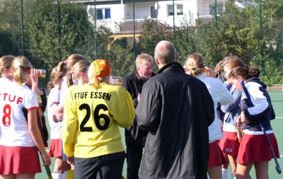 Die Mädchen des ETuF Essen in der Halbzeitbesprechung im Endspiel gegen den Rüsselsheimer RK