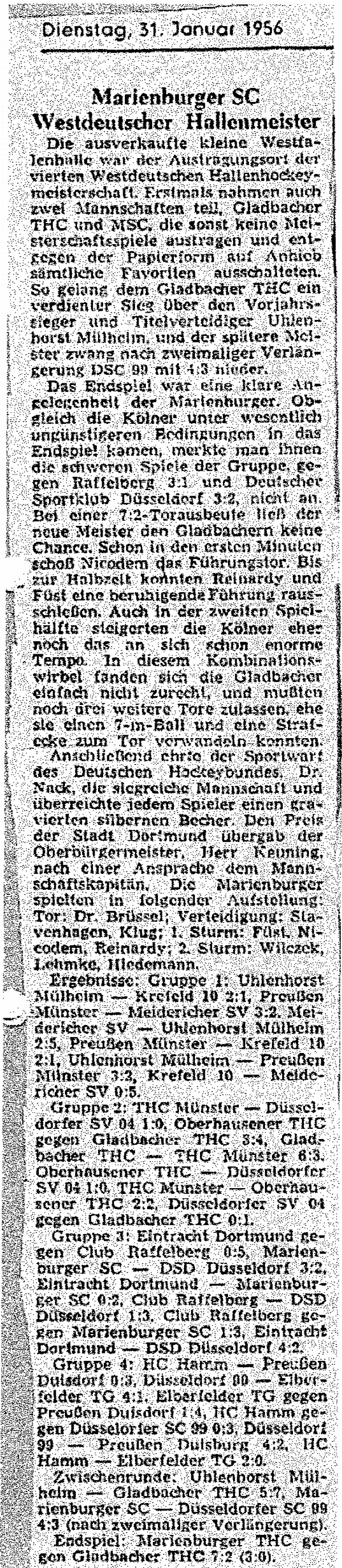 Am 29.01.1956 feierte der Marienburger Sport Club Köln (MSC) einen großen Erfolg; der Verein wurde in Dortmund Westdeutscher Meister im Hallenhockey.