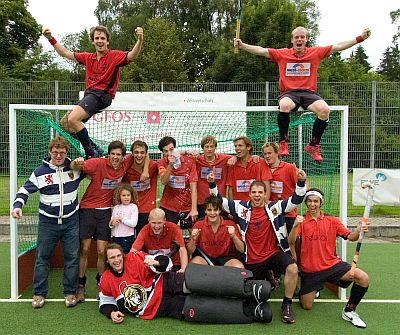 Der Düsseldorfer HC hatte nach seinem letzten Spiel beim Absteiger ETuF Essen wirklich allen Grund zum Jubel. Mit der aus 18 Spielen maximalen Ausbeute von 54 Punkten schafften die Jungs von Trainer Volker Fried souverän den Aufstieg in die erste Liga. Foto © www.hockeyfocus.de