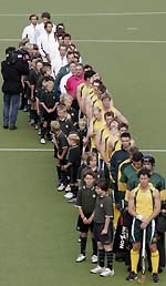 9.8.2005 - Wie Teammanager Dieter Schuermann soeben mitteilte, wird am Sonntag, 14.8.05 im Rahmen der WDRIII-Sendung "Sport im Westen" eine Reportage über das neue Mönchengladbacher Hockeystadion gesendet, dazu erfolgen Aufnahmen vom Training der Mannschaft in Hamburg. 1. Spiel: Deutschland - Australien 1 : 0 (1:0) Tor durch Christopher Zeller in der 15. Minute 8.8.2005 - Im ersten von zwei Spielen gegen Australien, das nun doch als offizielles Länderspiel gewertet wird, kam das Team von Bernhard Peters, obwohl sozusagen von der Autobahn direkt auf das Spielfeld auflaufend, in einem sehr guten Spiel zu einem verdienten 1:0-Erfolg gegen den Olympiasieger. „Ich ziehe den Hut vor der heutigen Leistung. Das Team hat gesehen, dass es trotz der Neustrukturierung nach Athen jedes Team der Weltspitze schlagen kann. Es ist aber überhaupt kein Grund abzuheben. Dafür ist die Fehlerquote noch zu hoch. Vor allem hinsichtlich der Ballkontrolle haben wir noch einiges zu verbessern“, sagte Bundestrainer Bernhard Peters. Personaldisposition