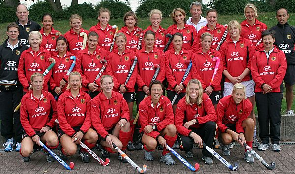 o.v.l.: Bundestrainer Markus Weise, Badri Latif, Janine Behrmann, Anke Kühn, Natascha Keller, Britta von Livonius, Barbara Vogel (TW), Co-Trainer Wolfgang Kluth, Nadine Ernsting-Krienke, Eileen Hoffmann, Co-Trainer Jamilon Mülders