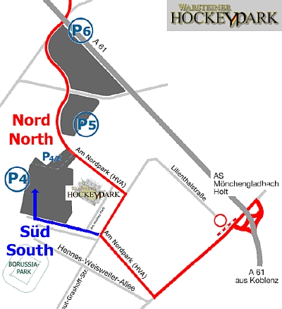 Anfahrt für Busse Die vorbereiteten Busparkplätze befinden sich im südwestlichen Segment von P4. (Auf der Zeichnung unten links), blaue Route zur Zufahrt Süd. Die ersten beiden Reihen links von der Parkplatzeinfahrt im Segment P4-B sind für Busse reserviert. Eine Anfahrt zum Haupteingang ist nicht möglich. Bushaltestelle Die Bushaltestelle befindet sich am Ende der Hennes-Weisweiler-Allee. Sie wird von der Linie 17 vom MG Hauptbahnhof angefahren. Fahrradständer Die offiziellen Fahrradständer liegen gegenüber der Bushaltestelle hinter dem Hockeypark. Fahrräder können auch am Zaun in der Nähe des Haupteingangs angeschlossen werden. Dabei muss der Eingang als Fluchtweg komplett frei bleiben. Fundsachen Fundsachen werden im Volunteersbüro (Erdgeschoss des Bürogebäudes) aufbewahrt. Toiletten Öffentliche Toiletten für Zuschauer inklusive Behindertentoilette sind im Erdgeschoss des Warmbaus untergebracht. Mitbringen von Hunden Die Hausordnung verbietet es, Hunde auf die Anlage mitzubringen. |