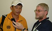 Wolf-gang Hillmann als Experten an seiner Seite. ![]() Jörg Tomzig erfasst mit einem Handy ein Interview für einen Team-Podcast. Sein Gesprächs-partner der malayische Trainer Tai Beng Hai. ![]() Barbara Schimmele - unsere junge Universalkraft, ob in der Bildredaktion oder wie hier am Liveticker. |